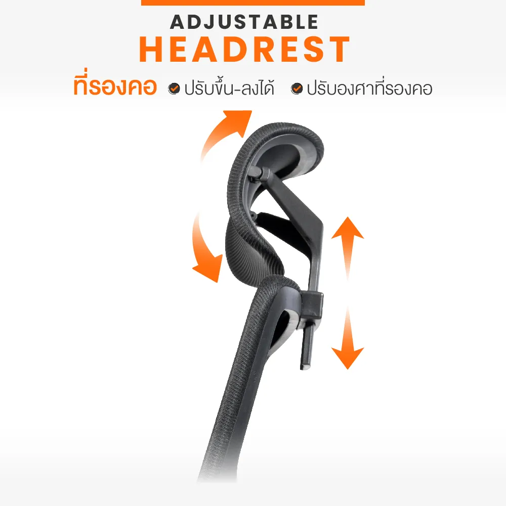 • 🧠 ที่พักศีรษะ (Headrest): หุ้มผ้าตาข่าย ปรับองศาและระดับสูง-ต่ำได้ (และถอดออกได้)