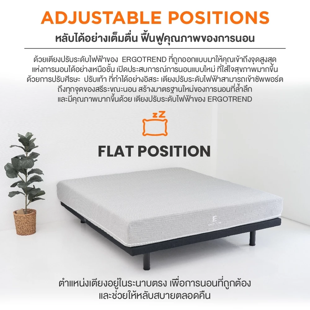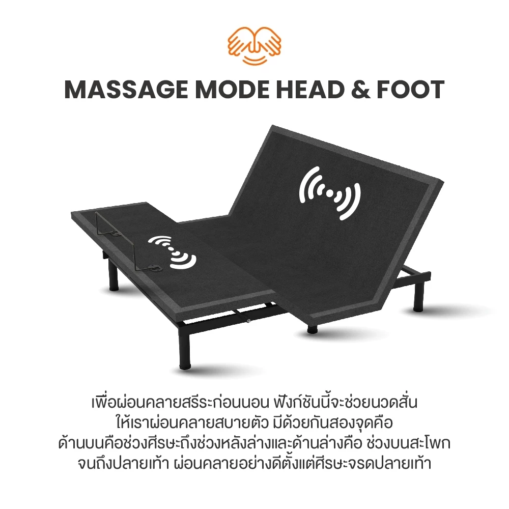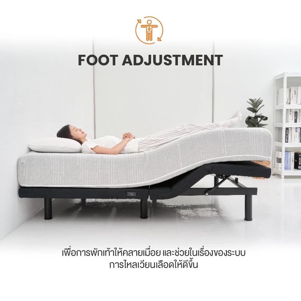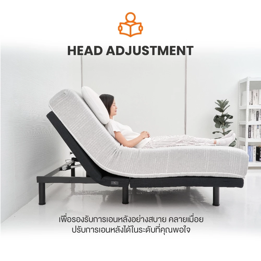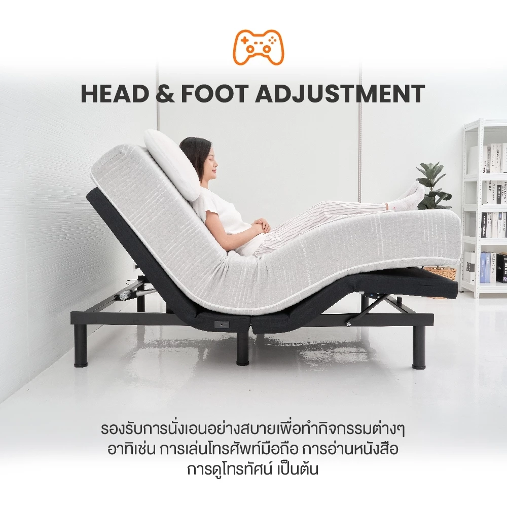 - ปรับหัวและเท้าแยกกันอิสระ — อ่านหนังสือ ดูทีวี หรือเล่นโทรศัพท์ข้างเตียงได้สบาย ไม่ต้องกองหมอนไว้หนุนหลังอีกต่อไป
